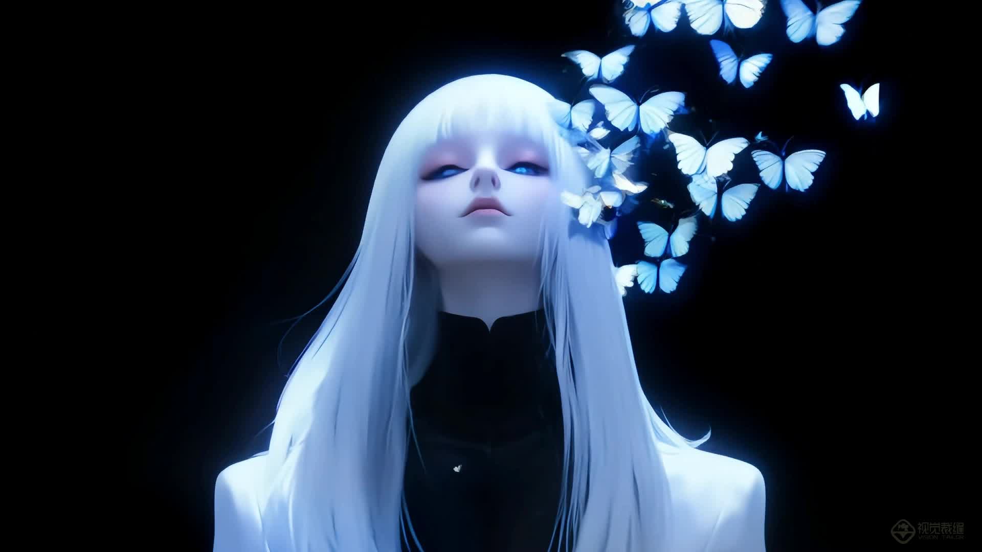 唯美 意境 特效 待客 静谧 蓝色 人物 蝴蝶 蓝色 渐变 浪漫(此素材仅供学习参考,禁止商用)