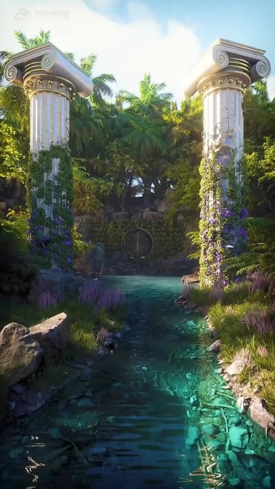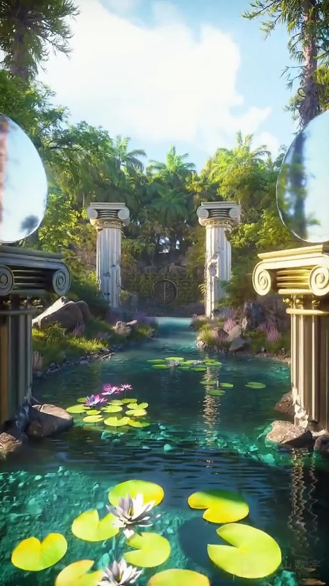 竖屏 阳光 向日葵 温暖 穿梭 花园 搭配 明亮 绿色 池塘 城堡 天空 大气 悠闲(此素材仅供学习参考,禁止商用)