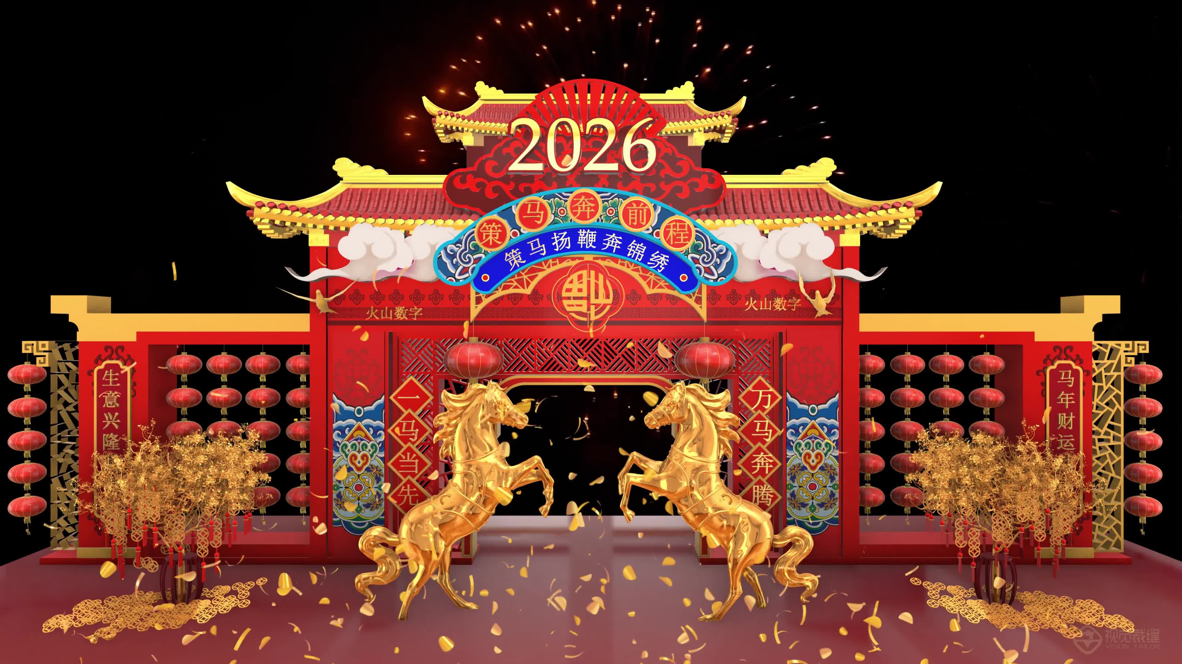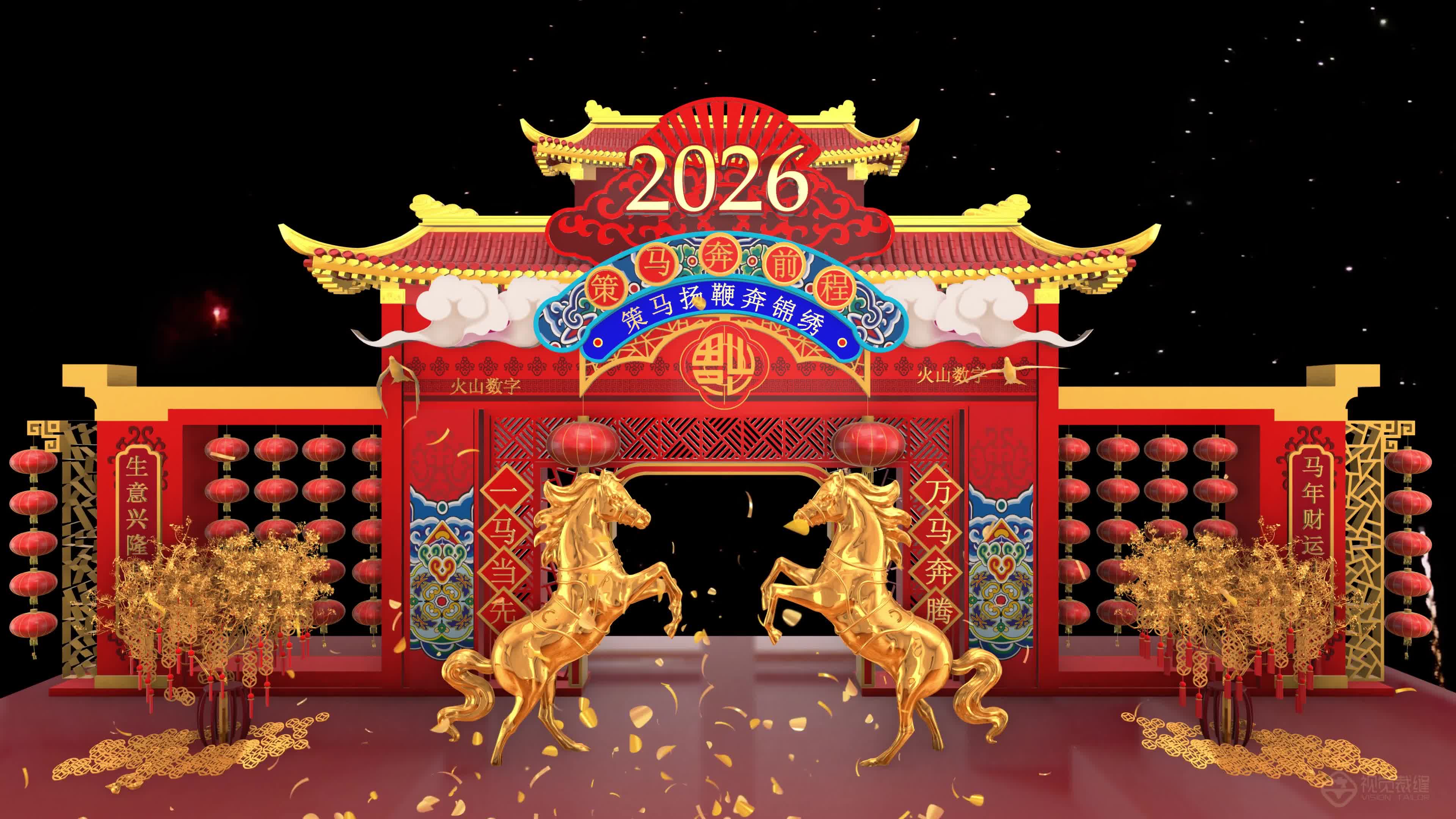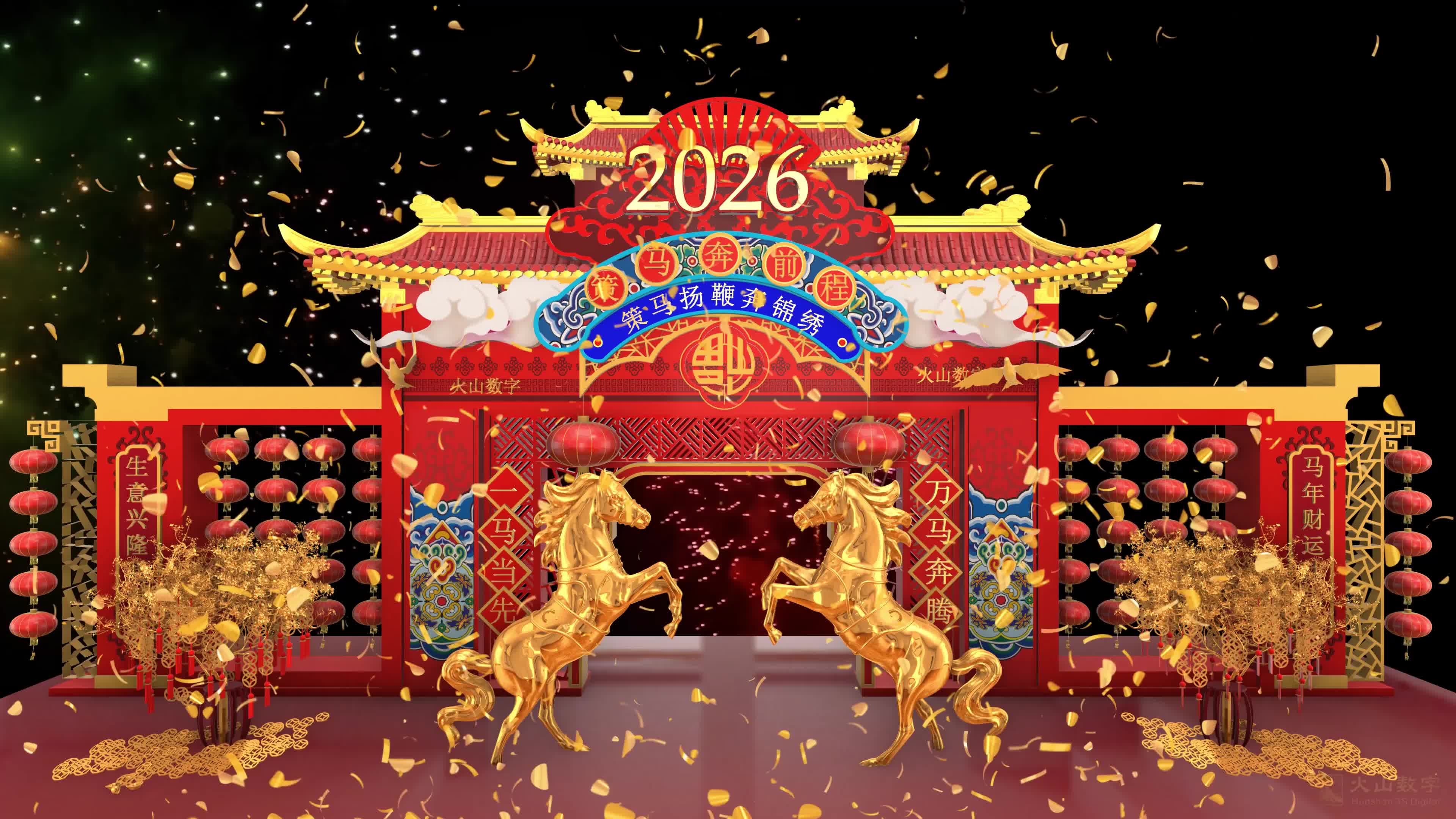 定制 新春 节日 空间 场景 金色 背景 马年 喜庆 2026 新年祝福 春节祝福 2026马年 金色春联 福字 满屏(此素材仅供学习参考,禁止商用)