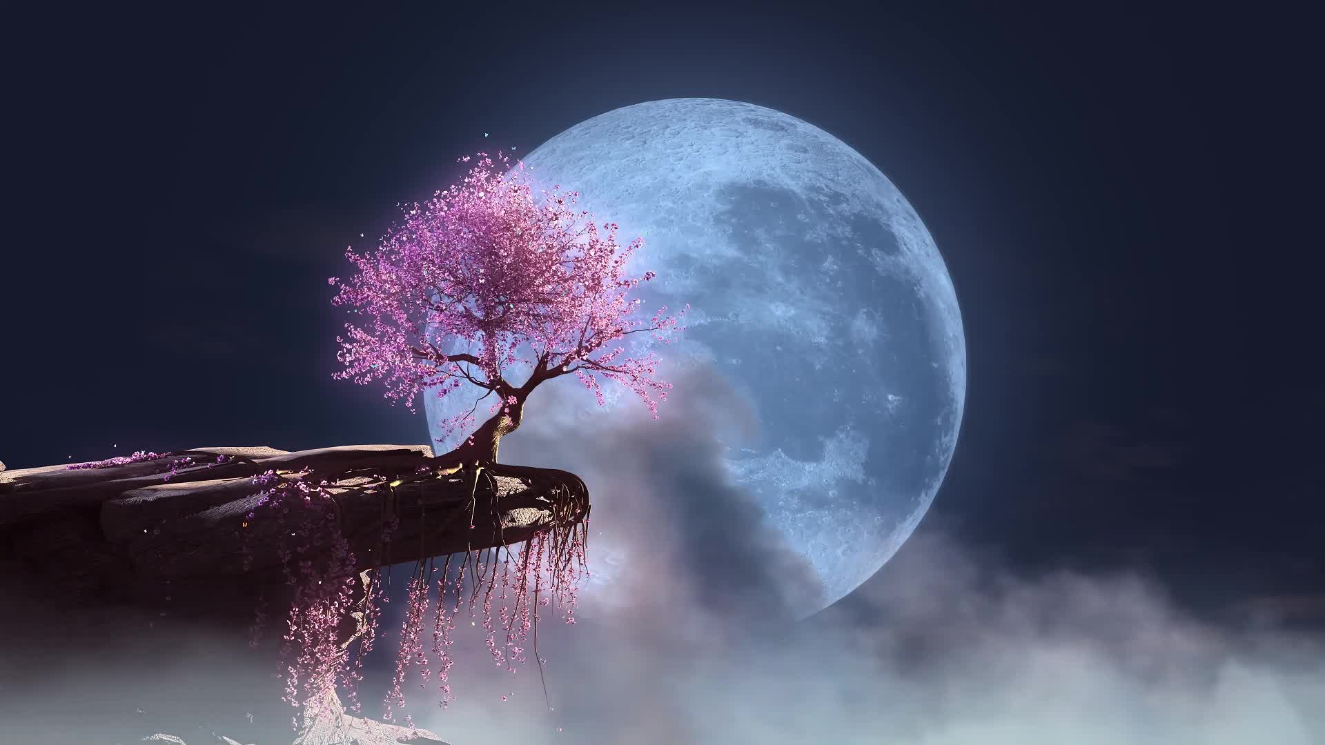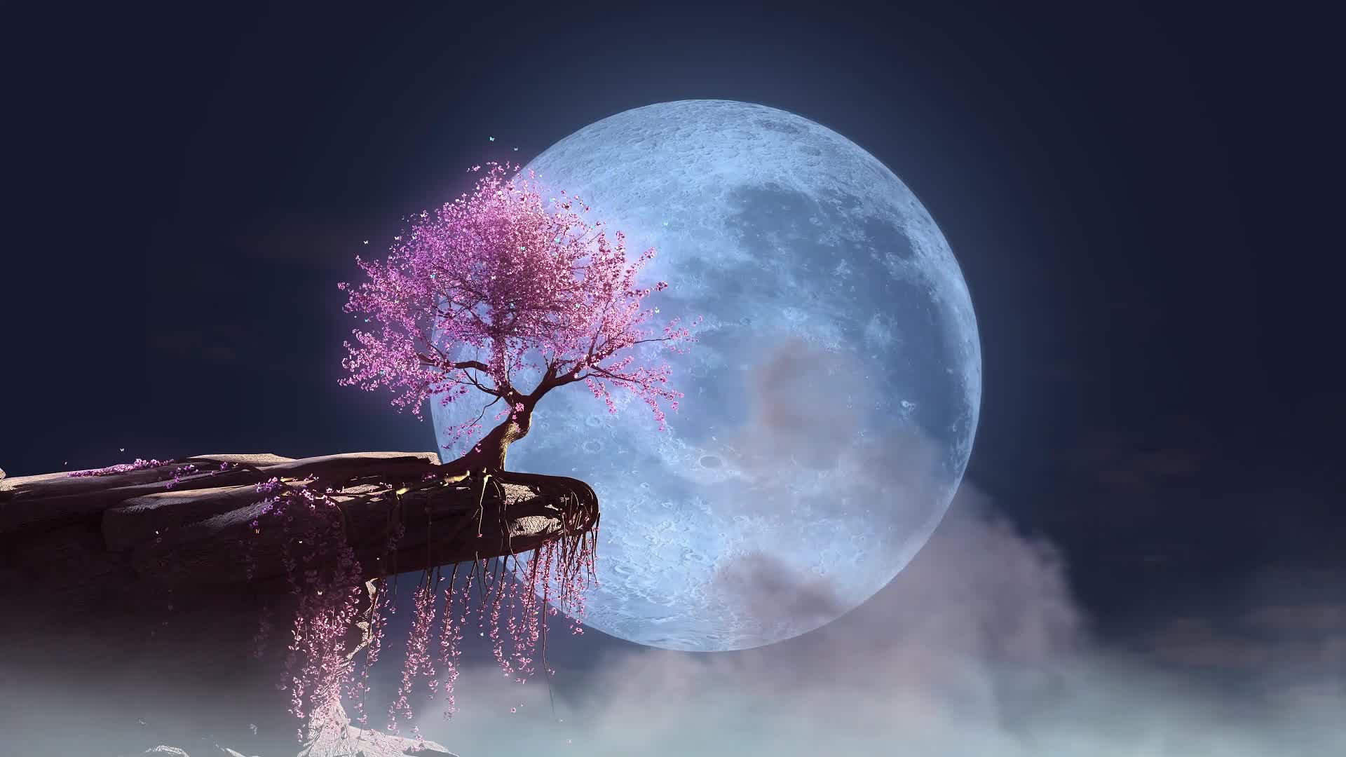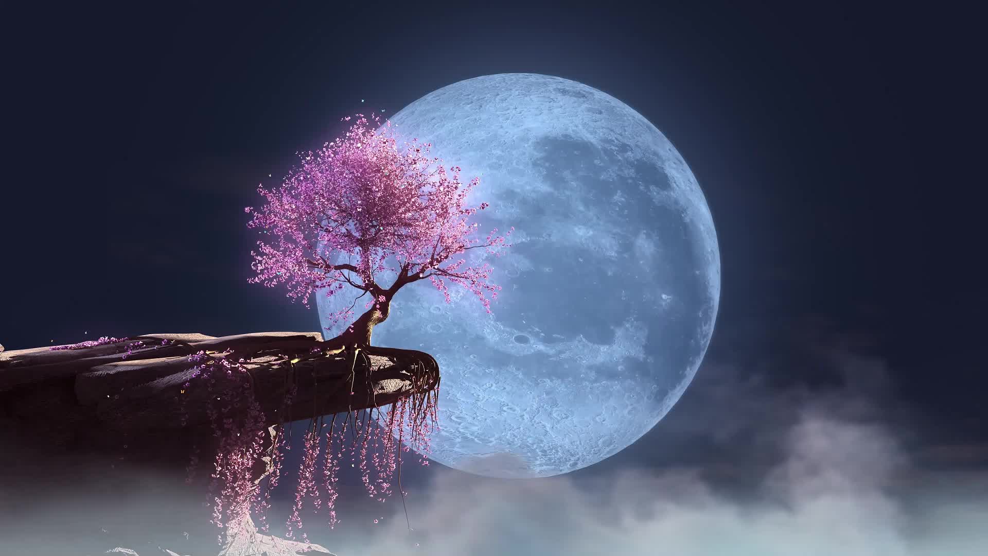 古风 樱花树 圆月 月亮 氛围 不规则运动 静谧 抒情 舒缓 温和 温柔 艺术 悠闲(此素材仅供学习参考,禁止商用)